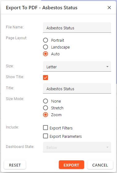 When exporting to PDF, click the PDF icon above. The following dialogue box will appear and provide you with some export options.