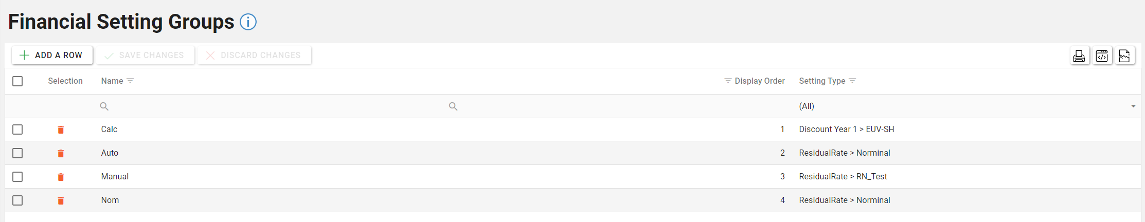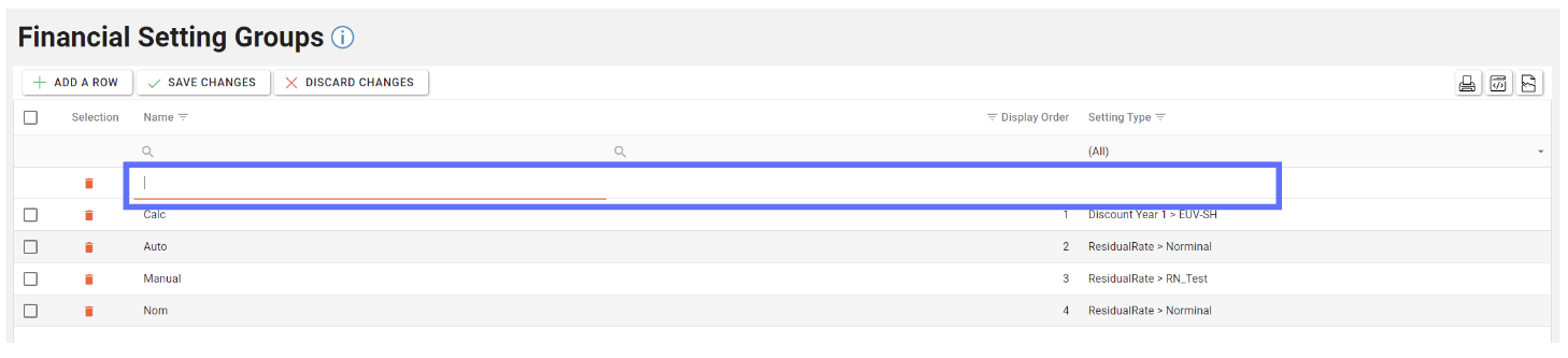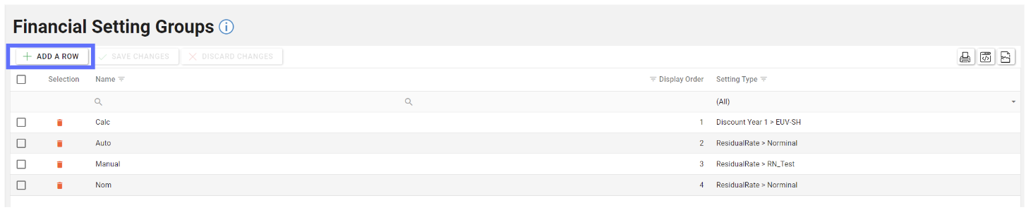To create a Financial Setting Group click on the “Add A Row” button in the toolbar at the top of the screen.