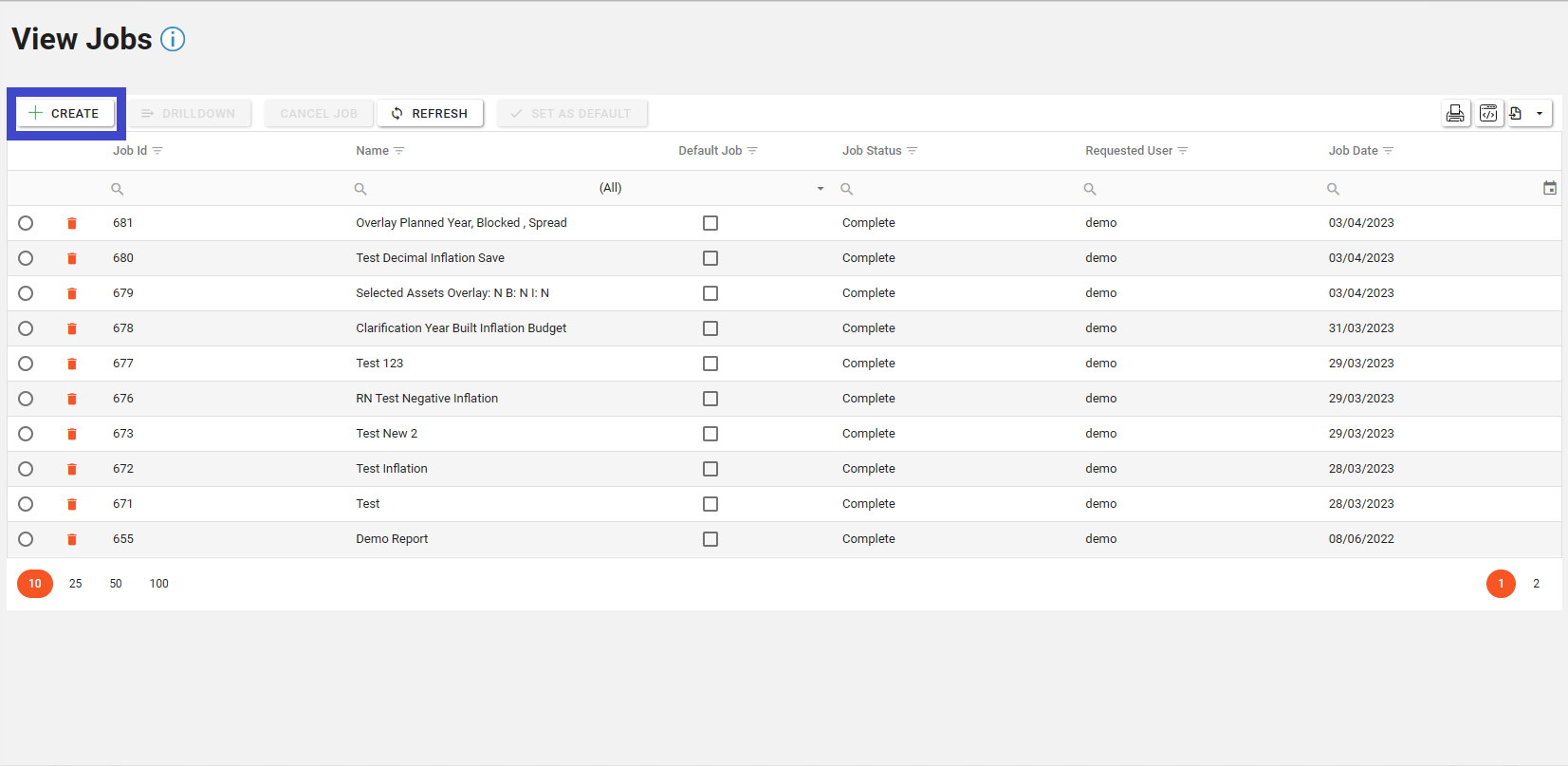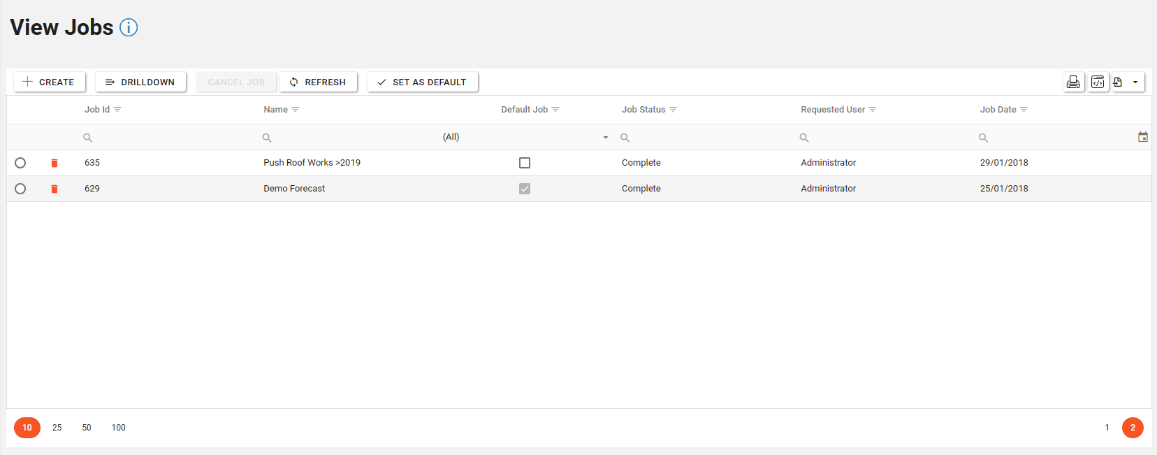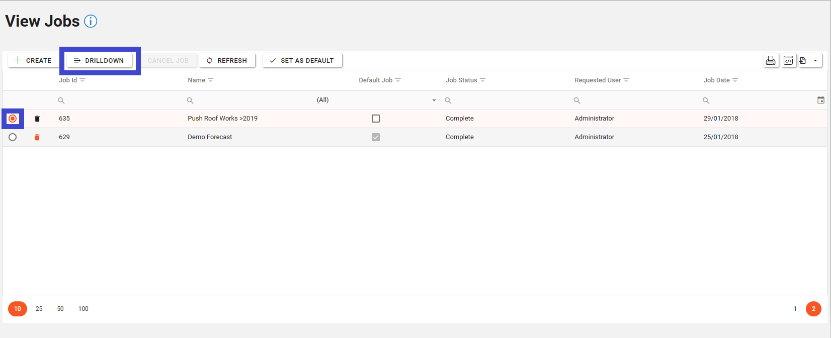 To view an existing forecast job, select the required job by clicking the selector icon in the leftmost column. Once selected, the job will be highlighted. Then click the “Drilldown” button to view the forecast.