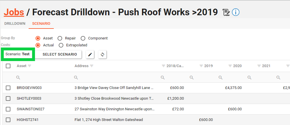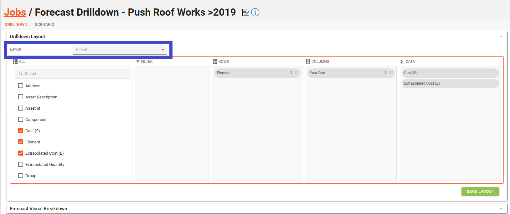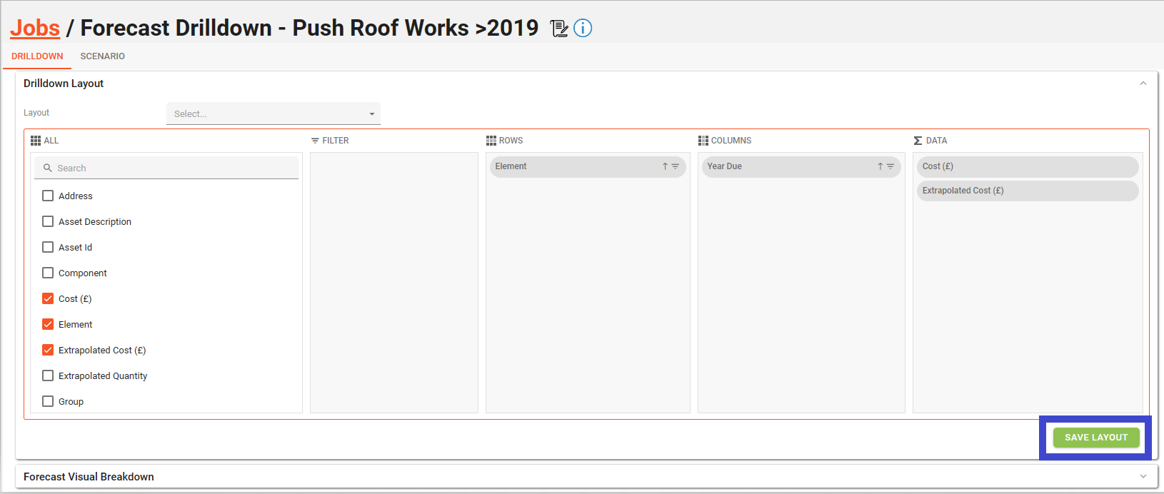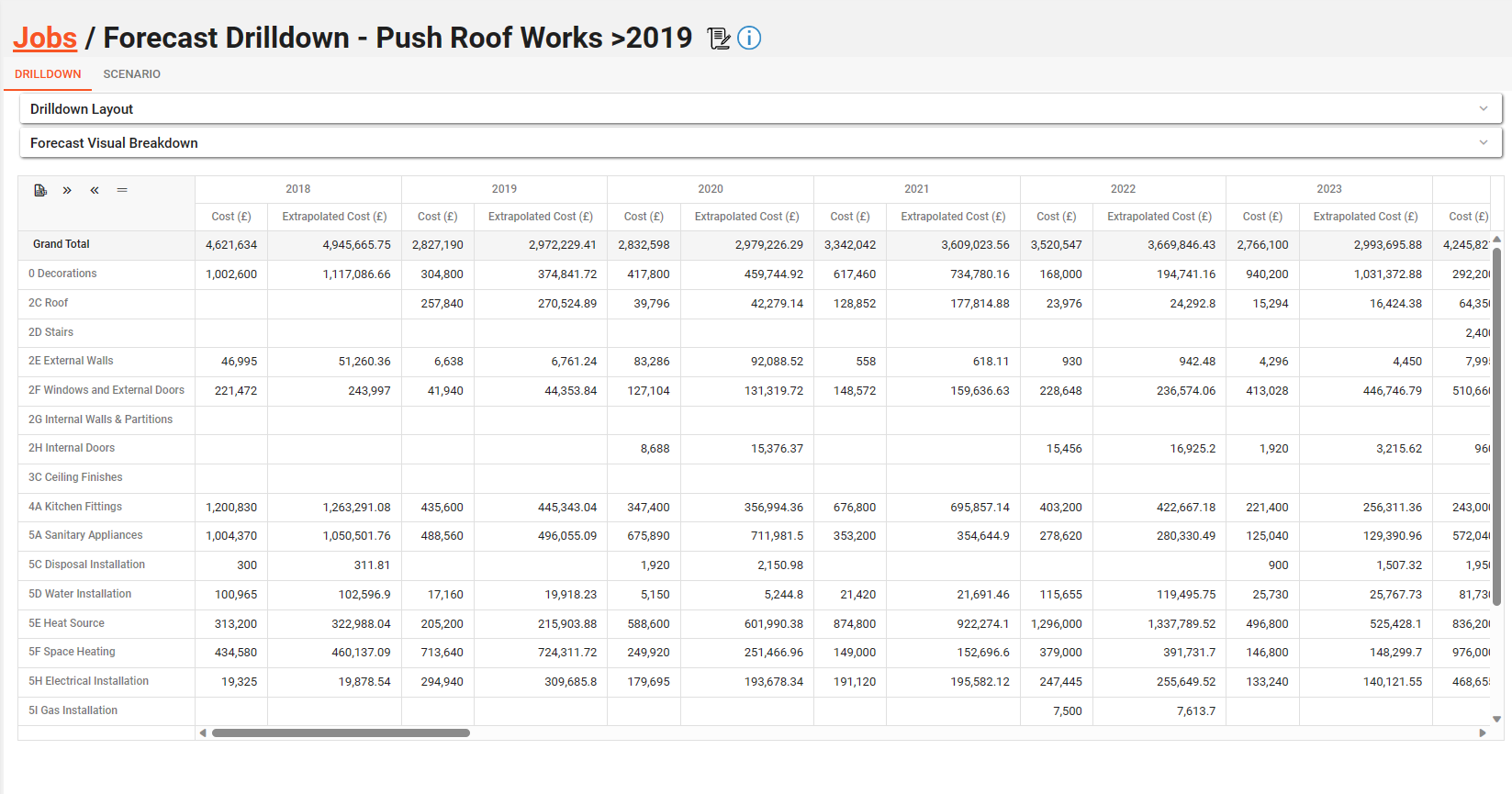 When the “Drilldown” button has been clicked, the screen will load the Forecast data for the selected Job. There are two tabs within the forecast job “Drilldown” and “Scenario”.