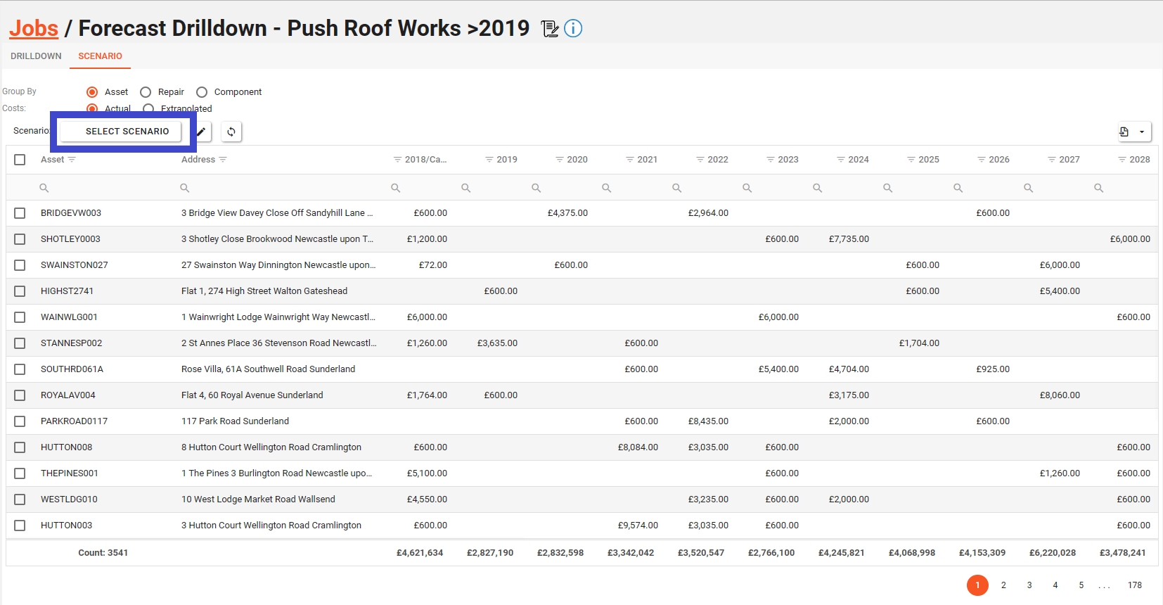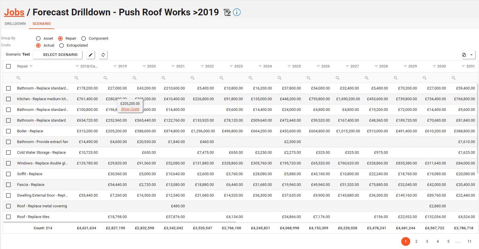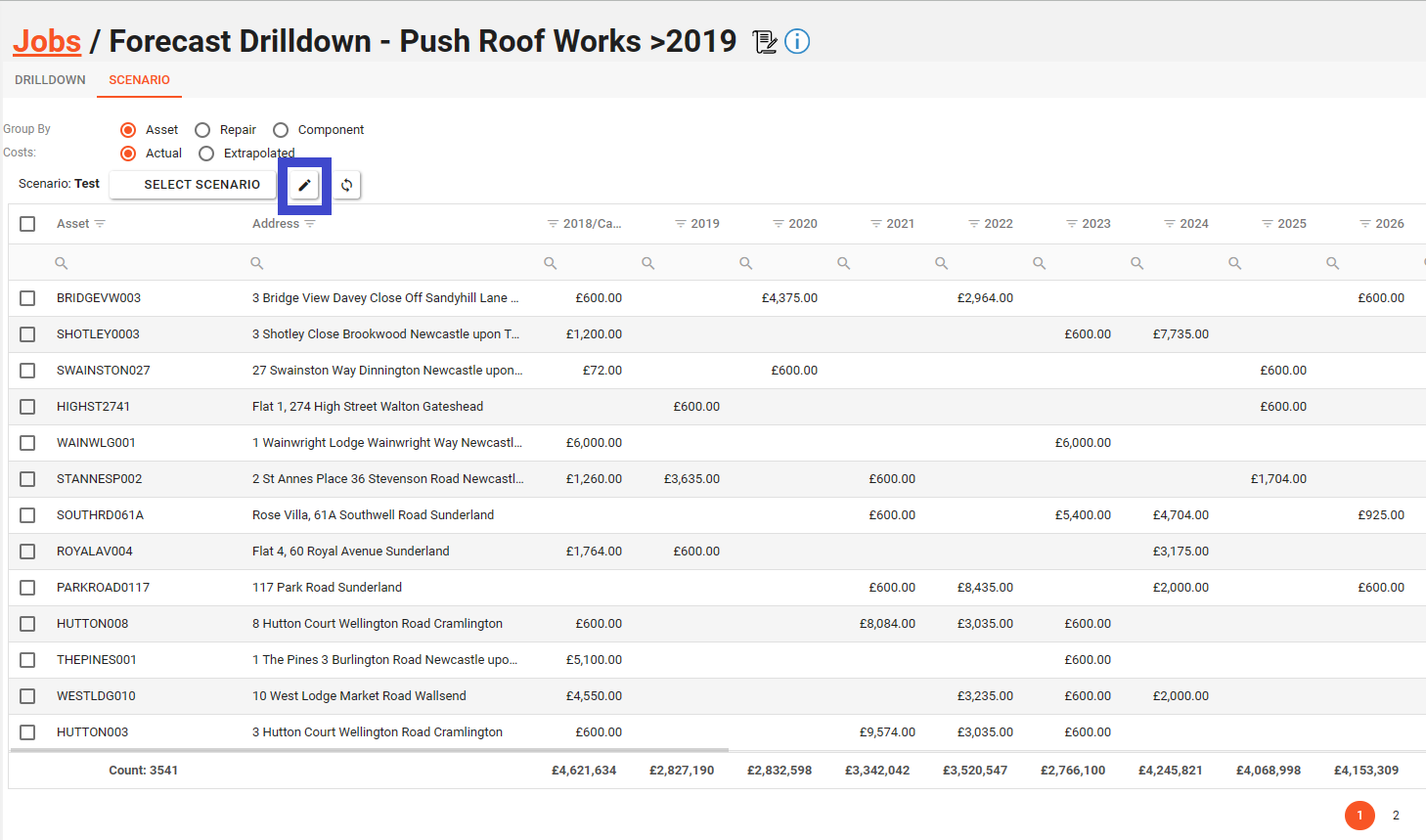 When the “Drilldown” button has been clicked, the screen will load the Forecast data for the selected Job. There are two tabs within the forecast job “Drilldown” and “Scenario”.