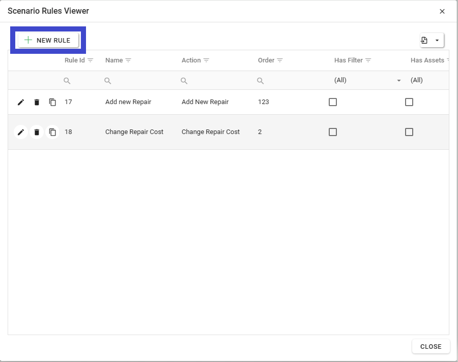 When the dialogue for Scenario Rules Viewer is open, users can see any current rules being applied to the scenario. To add a new rule, click the “New Rule” button.