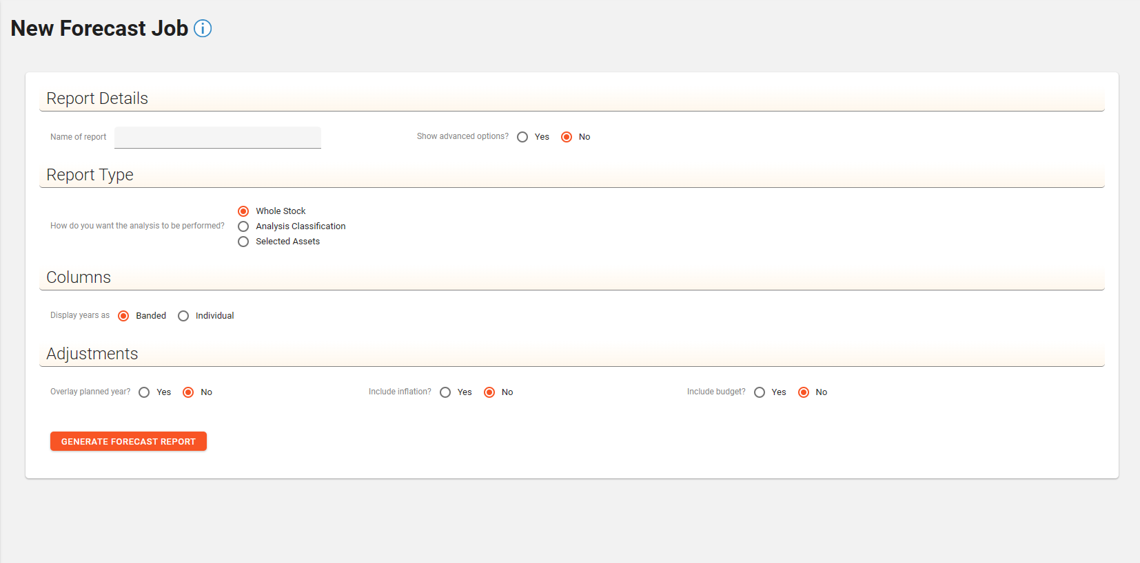 Selection Criteria | This is driven by the report type. If whole stock is selected this element is removed. If Analysis Classification is selected this is where you define the classifications you want to use. If Selected assets is used, this is where you select the assets you wish to run the forecast for. |