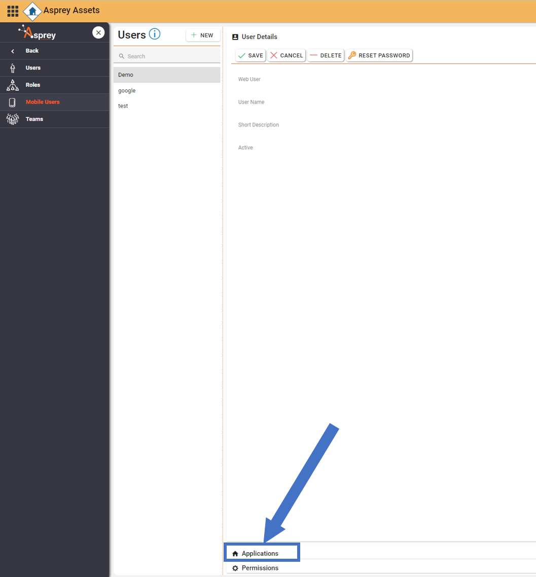 To assign users to mobile applications, select the user from the “mobile users” section and click “Applications” in the right-hand side of the screen.