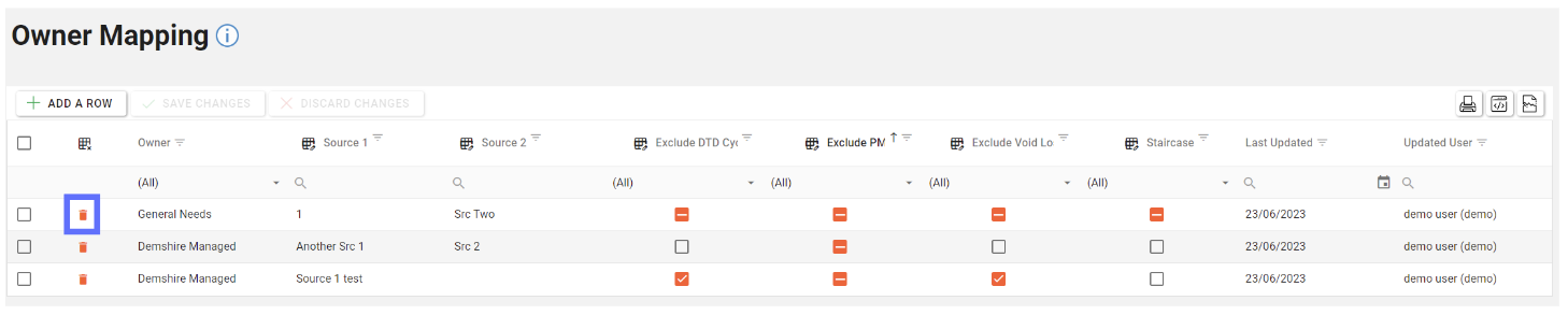 Choose the Owner Mapping you want to delete by clicking on the trash can button adjacent to the row you want to remove.