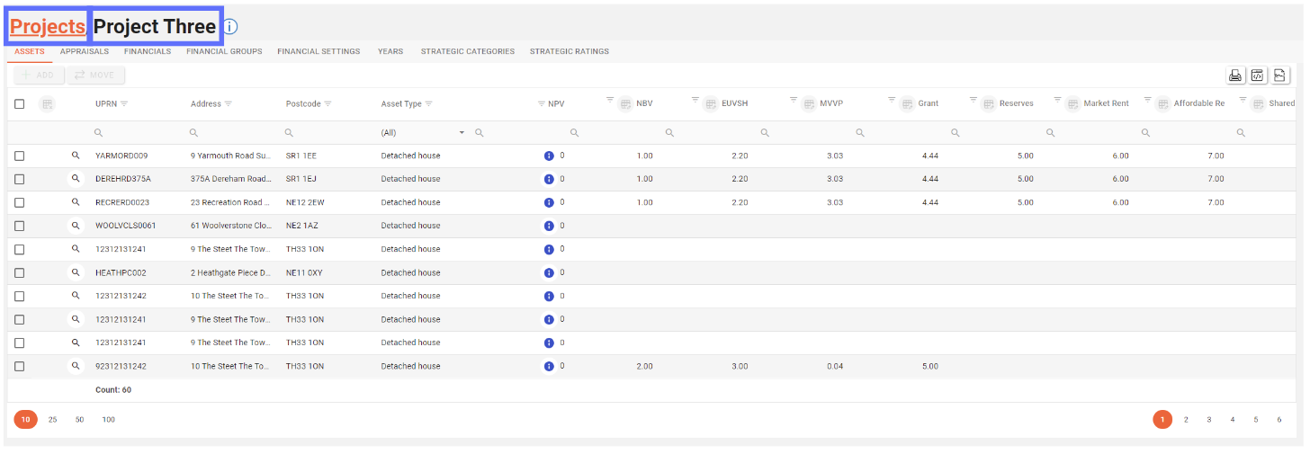 The Project Drilldown screen allows a user to maintain the Assets, Appraisals and a plethora of financial settings at a Project level.