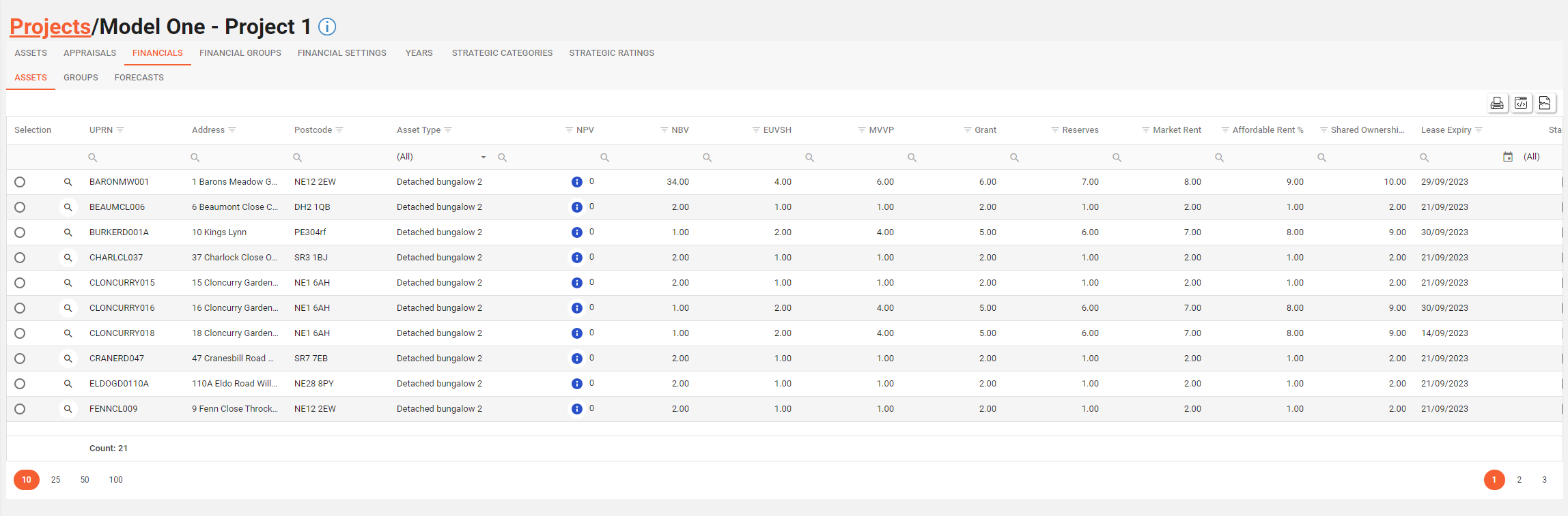 The Project Financials screen allows a user to maintain the financial override values for Project Assets via several tabs.
