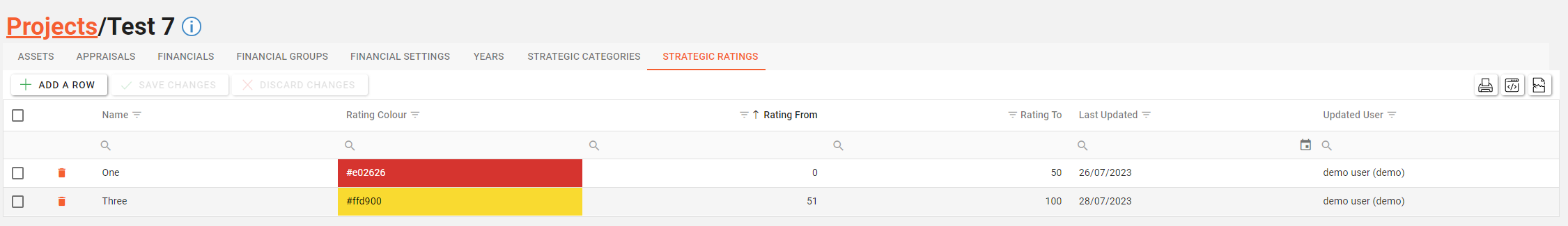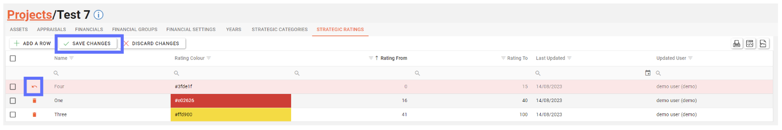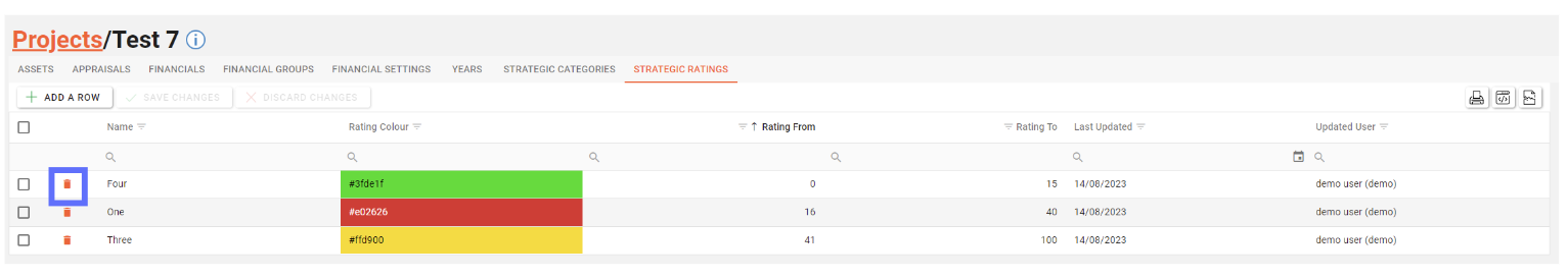 Choose the Project Strategic Rating you want to delete by clicking on the trash can button adjacent to the row you want to remove.