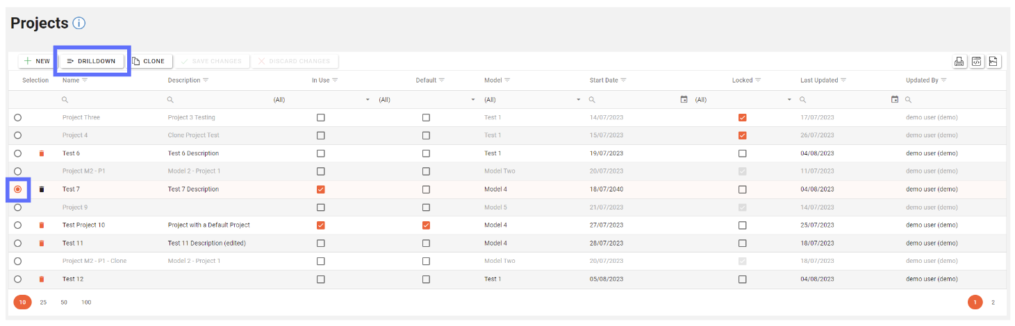 First choose which Project the Strategic Rating will be set up under by choosing from the Projects screen and clicking on the “Drilldown” button.