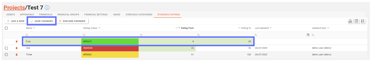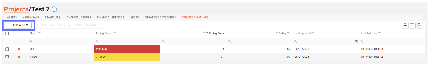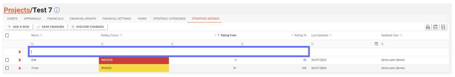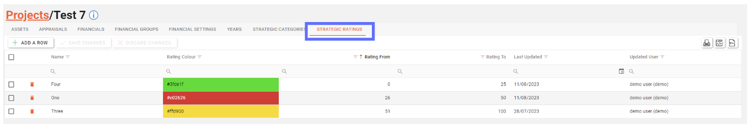 The Project Strategic Rating tab allows a user to create, edit and delete Project Strategic Ratings for use by linked Appraisals.