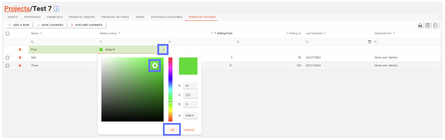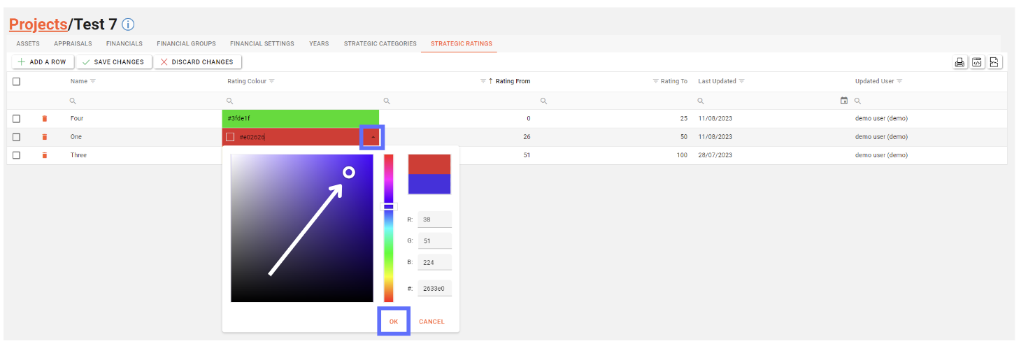When choosing a colour for the new Project Strategic Rating, you will need to click on the upwards arrow located on the right-hand side of the colour cell. This will open a colour picker from which you are free to choose whichever colour you want to assign to the Project Strategic Rating using the white circle picker.