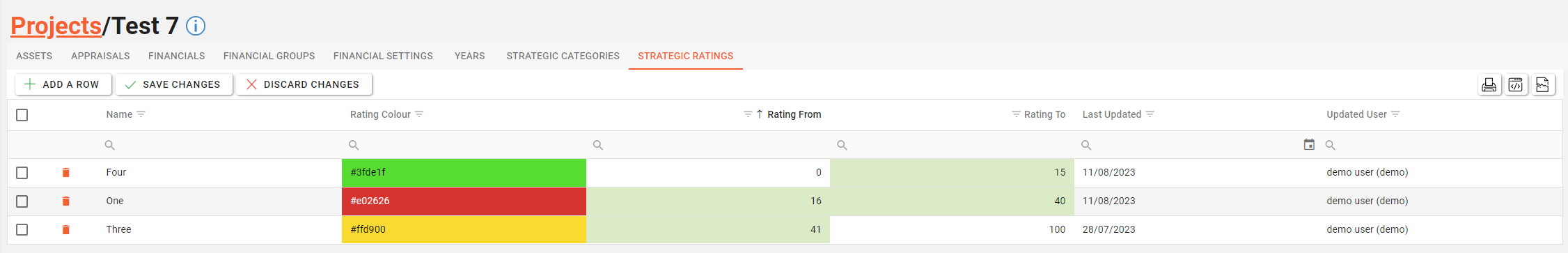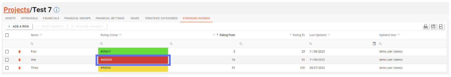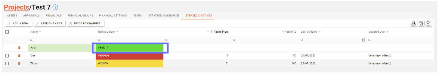 Colour | Text | A field to indicate the colour of the Project Strategic Rating. The HEX value of the colour is stored in the database. |