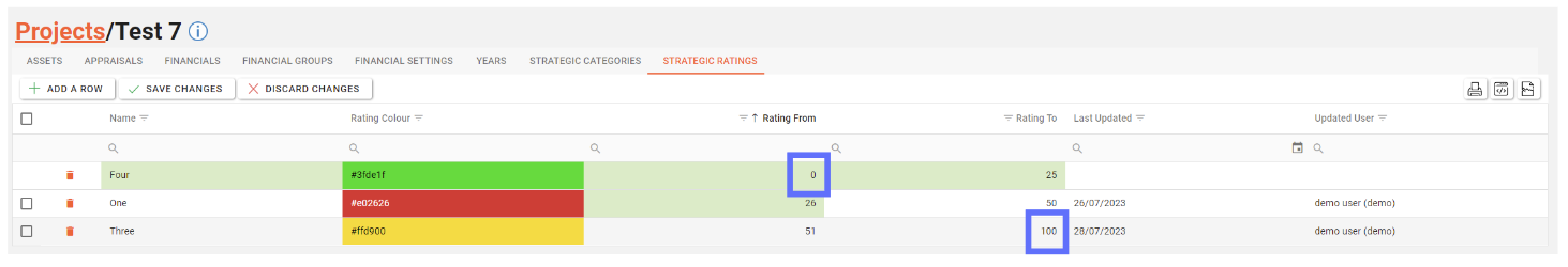 Project Strategic Rating’s are designed to have distinct bands denoted by “Rating From” and “Rating To”.