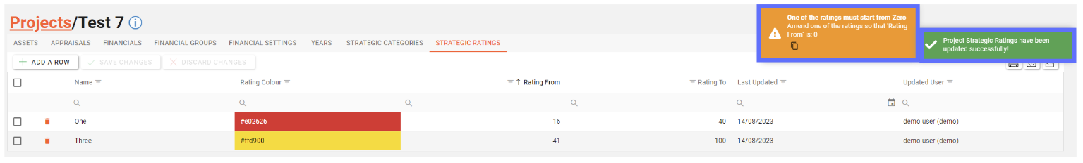 The changes will be saved to the database, this will be confirmed by the green toast popup message in the top right corner of the screen, reporting “Project Strategic Ratings have been updated successfully!”.