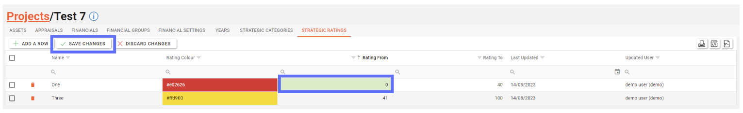 Rating From & Rating To can be edited by typing into the Rating cell for any row. However before you click on the “Save Changes” button you must ensure that there is one row that has a Rating From equal to 0, one row that has a Rating To equal to 100. There must be no gaps or overlaps between he rating bands.