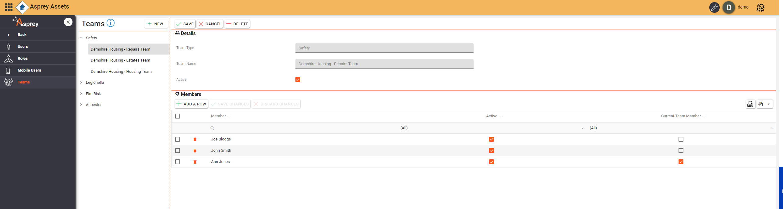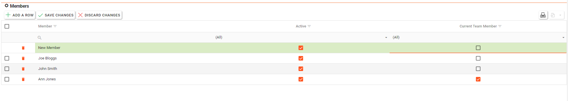 To add a member to a team, select the team from the left-hand side and select “Add a Row” under the “members” section. Enter the details of the team and check the “Active” and “Current team member” boxes ass required. Once complete, click the “Save Changes” button.