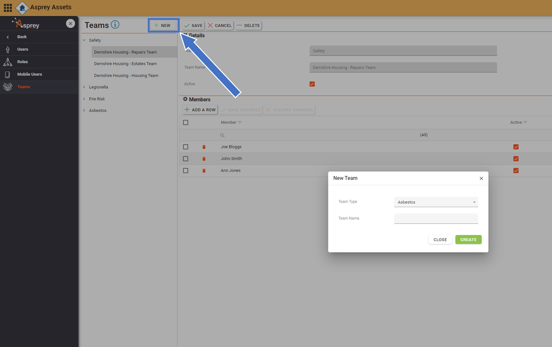 To add a new team, select the “Teams” menu from the navigation bar within the User Manager and click the “new” button.
