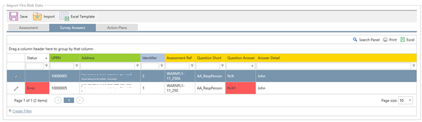 The import screens allow fire risk assessment data to be imported into Asprey FireRisk from Excel. Exporting allows the Excel survey data import template to be saved ready to use.
