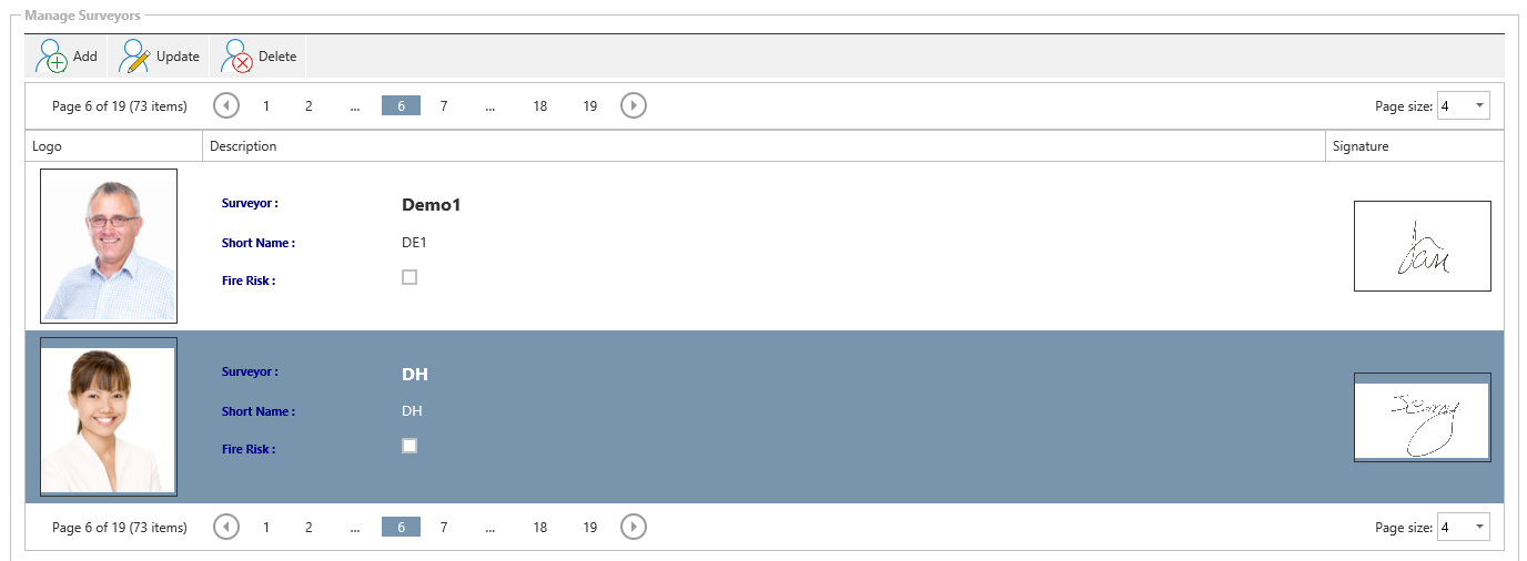 The Manage Surveyors screen allows surveyors to be added and any logo and signature for them set up. The logo can be a company logo or photograph and will appear on some reports. The signature will also be used on reports.